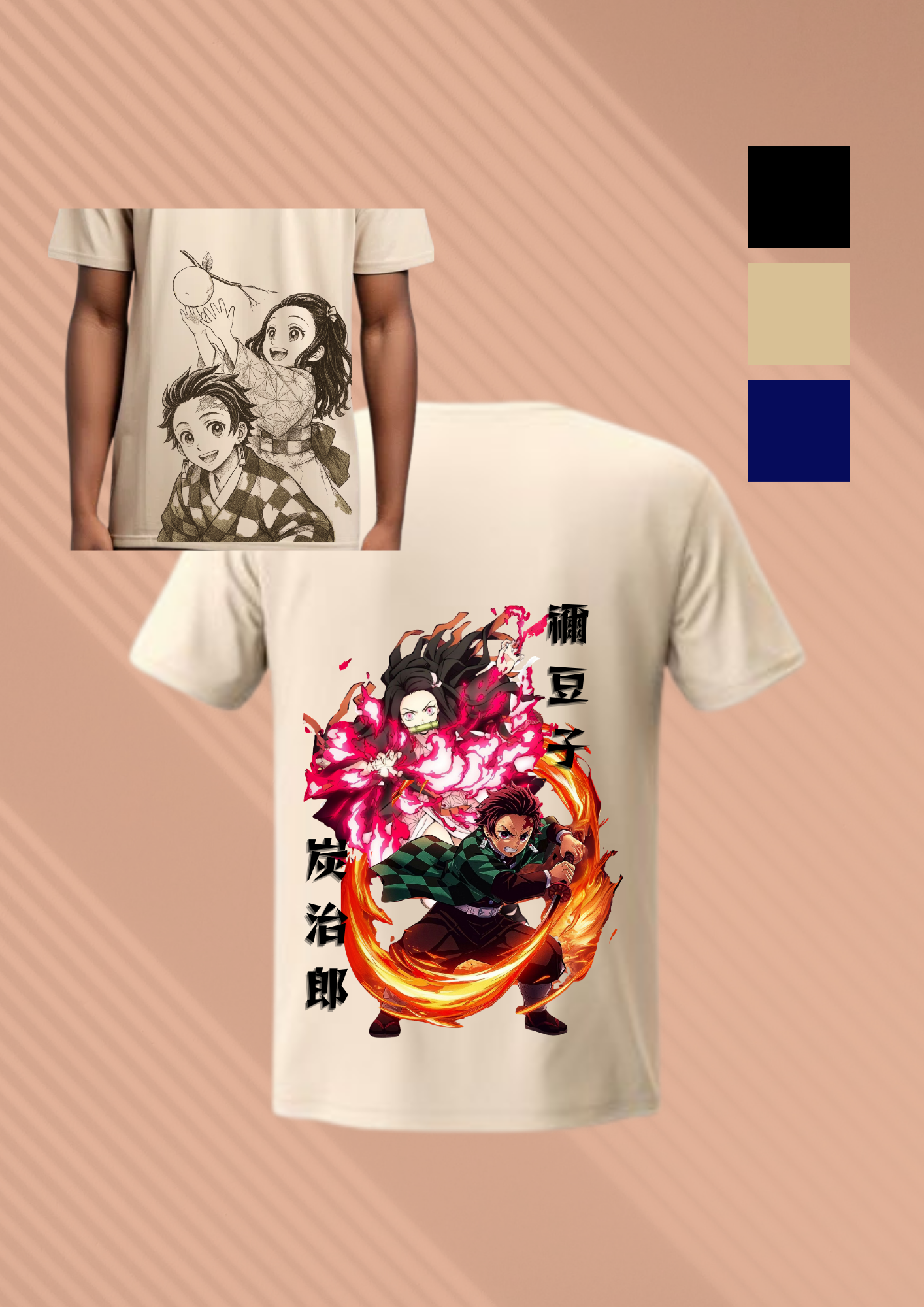 Celebrate the unbreakable sibling bond with this premium Regular/Oversized Cotton T-Shirt featuring Tanjiro Kamado and Nezuko in their most powerful forms. A design that captures fire and blood, strength and compassion—perfect for those who fight for the people they love.